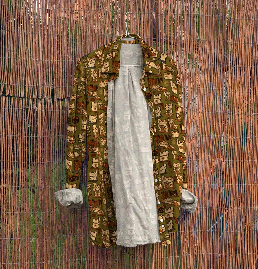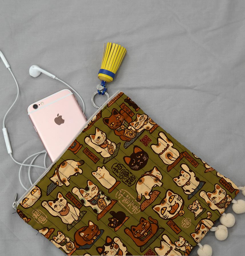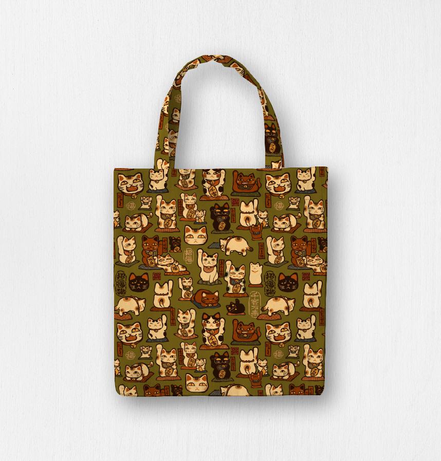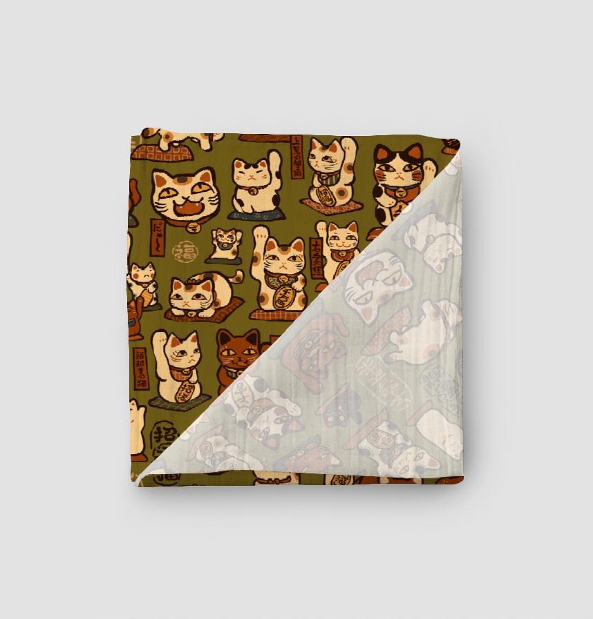 いろいろな招き猫たちが、おなじみの姿で福招いたり寛いだりしている様子のデザインです。