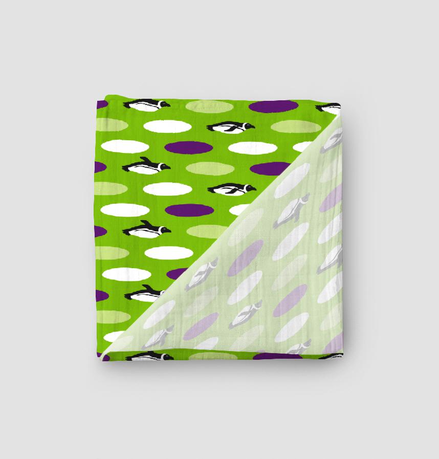 楕円形が規則的に並んでいる中にペンギンが飛ぶように泳いでいるイラストが隠れているデザインです。子供服やインテリア雑貨などにお使いください