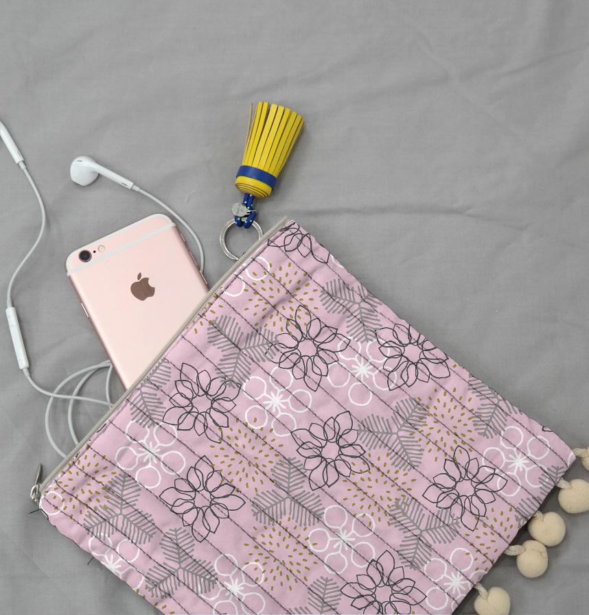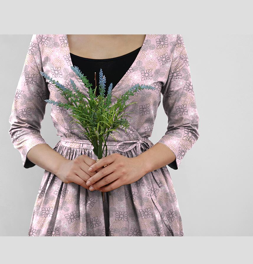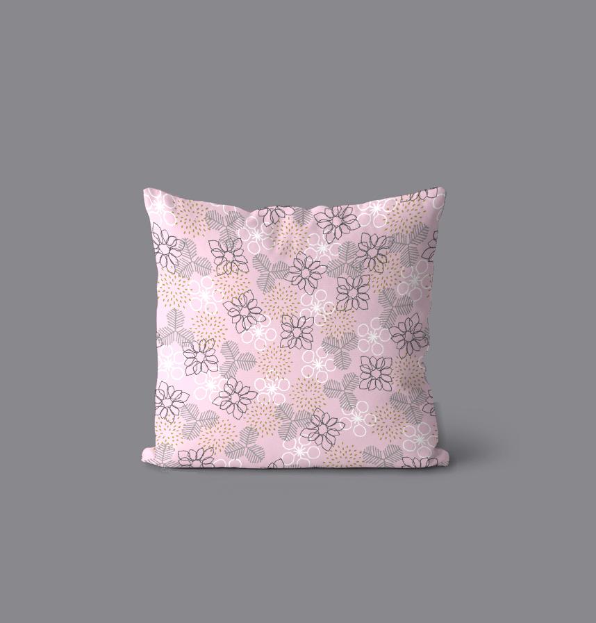 ピンク地に白、グレー、黄みの茶色の模様です。