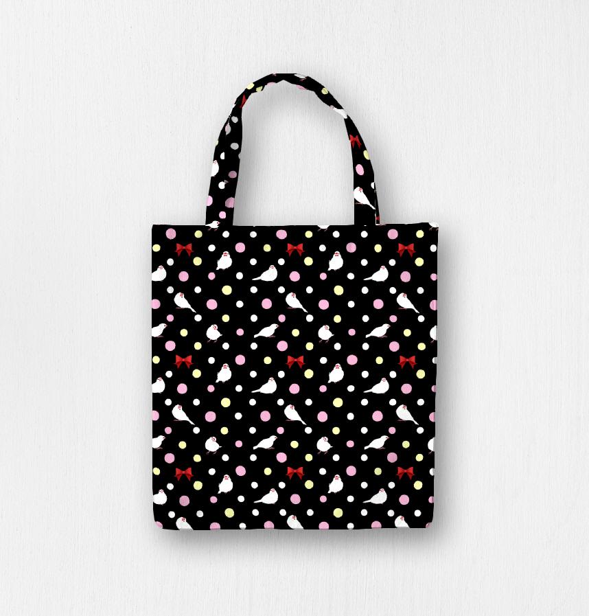 パターン説明 文鳥さんの可愛いポーズを水玉の中に入れました。ちょっと甘めの雰囲気ですが、背景を黒にして落ち着きを持たせました。サムネイルのパターン1セットで16.87cm*16.87cmサイズです。