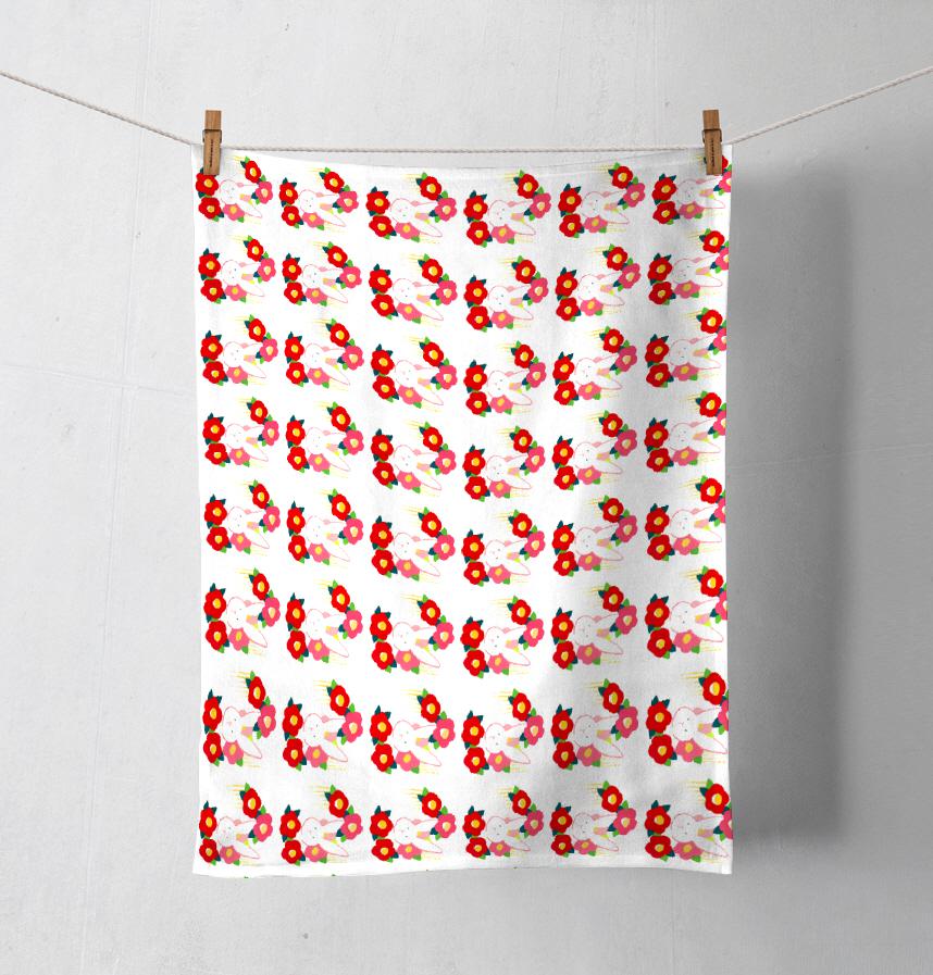 パターン名 うさぎと椿のかわいいパターン 手描きイラストの動物柄