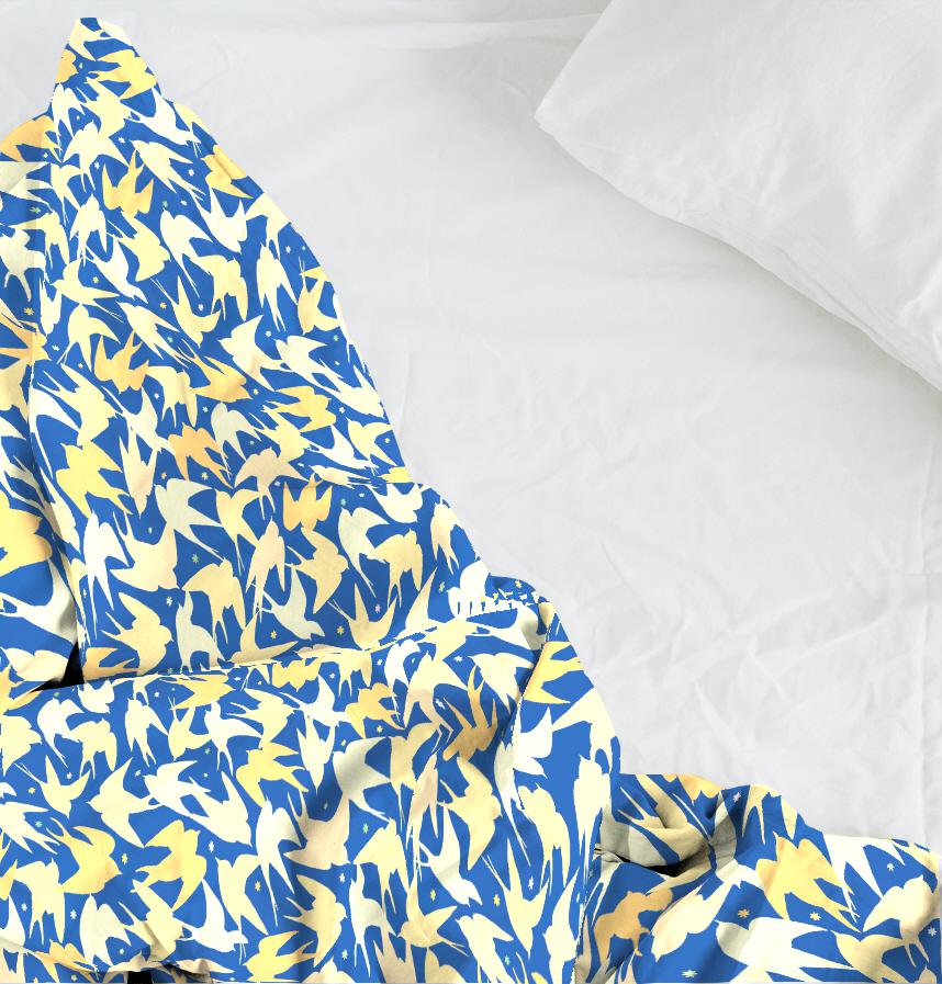 パターン説明 青い背景に抽象的なツバメ柄。シャツや雑貨におすすめ。