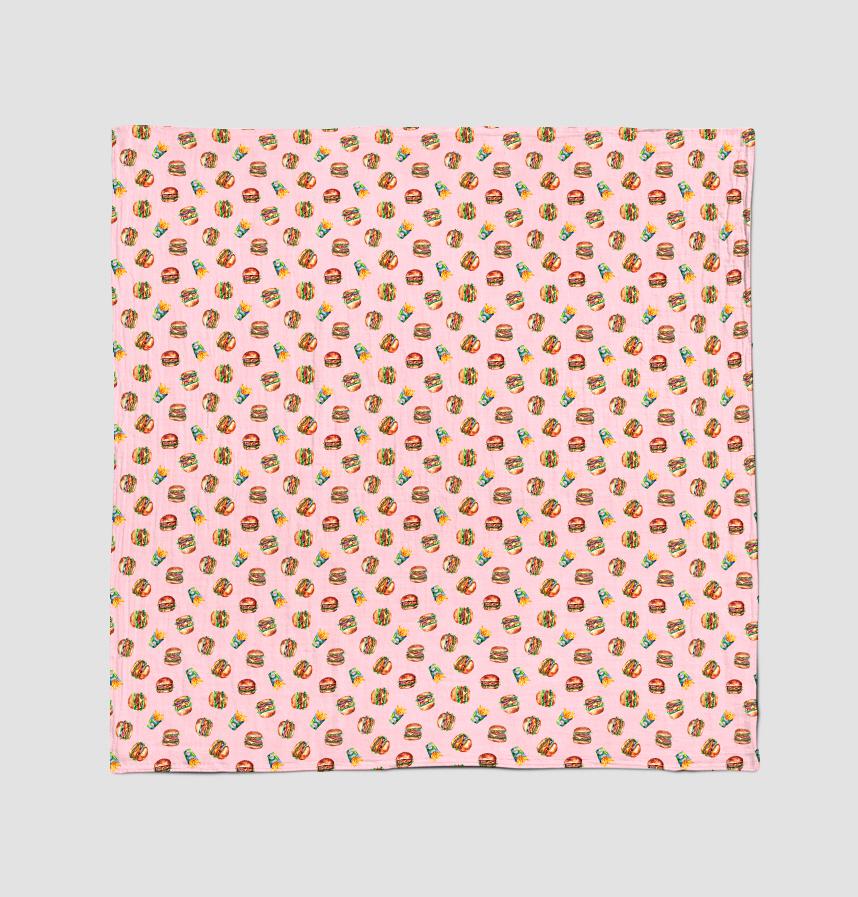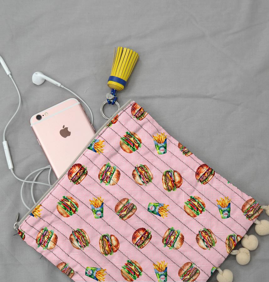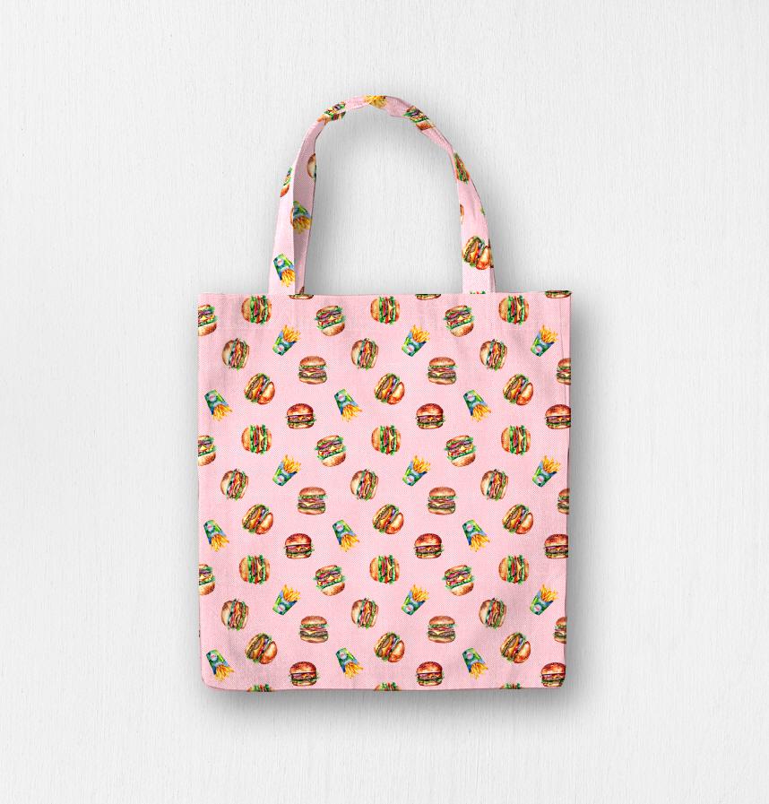 小さなピンクの水玉模様の背景に水彩画のバーガーとポテトが散らばります