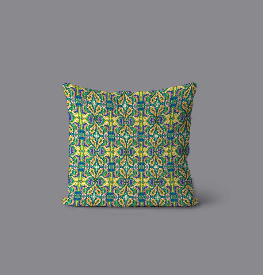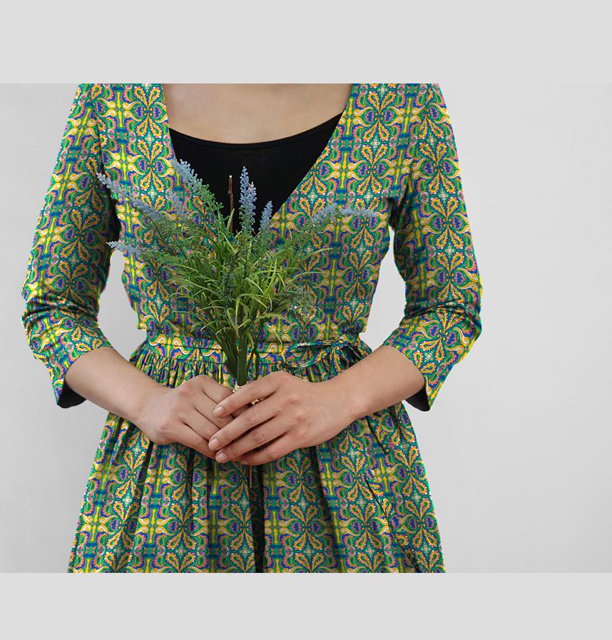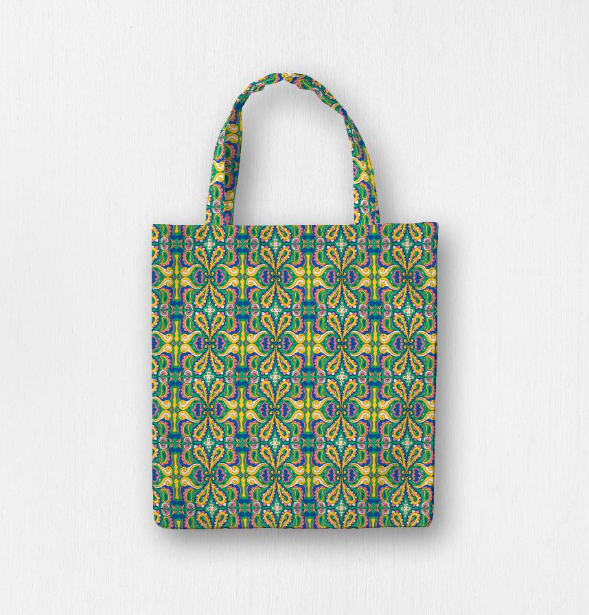 荘厳な柄にあえてポップで派手な配色を施して