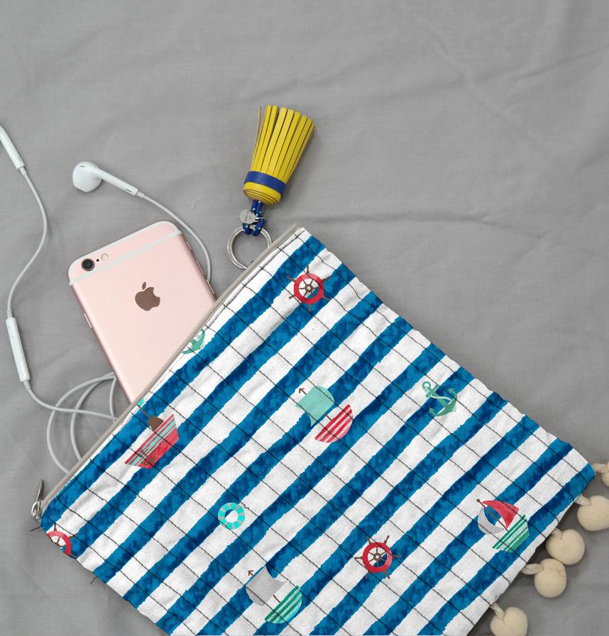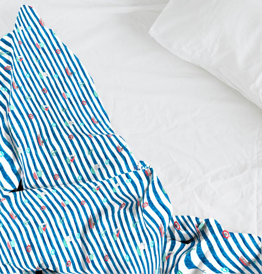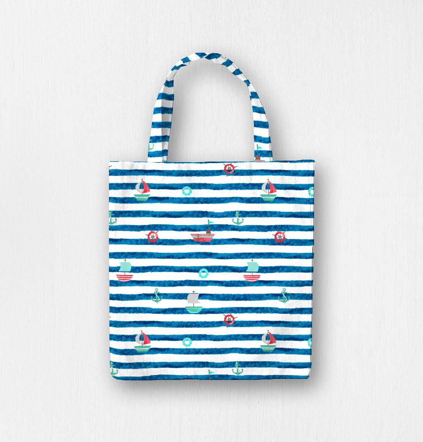 パターン説明 縞模様の波の上に浮かぶ帆船が涼しい感じを与えるマリンストライプデザインです。