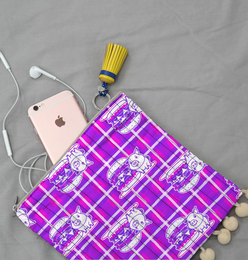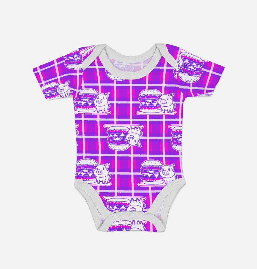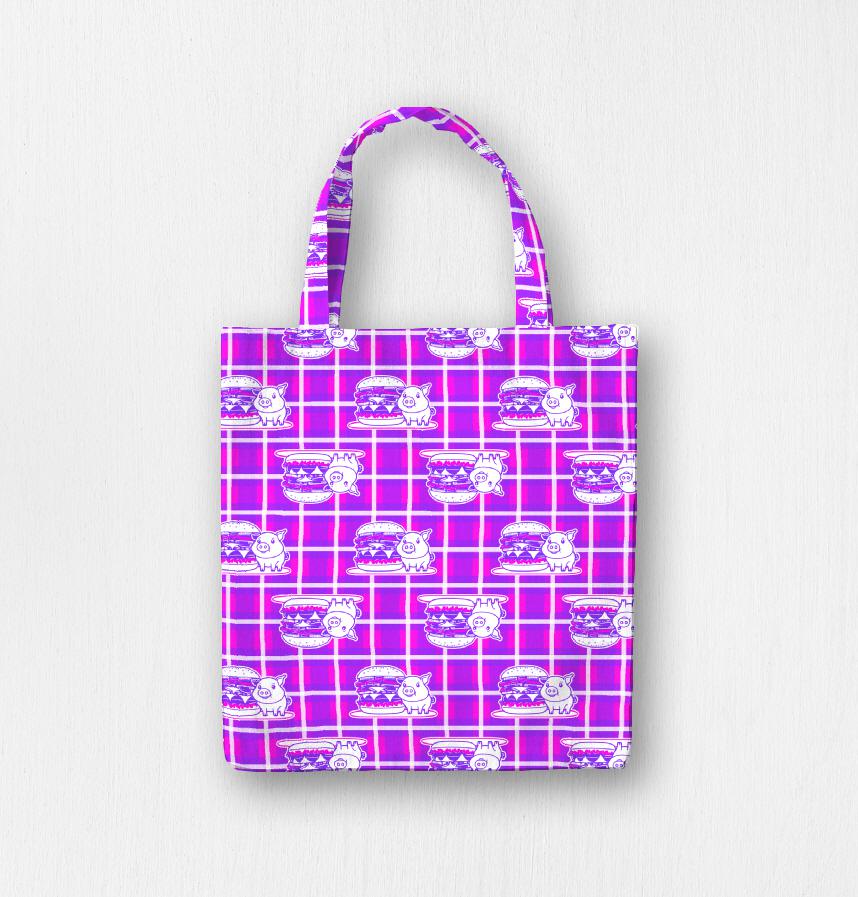 シンプルなラインで描いたボリューミーなハンバーガーと、にっこり笑顔のミニぶたちゃん。