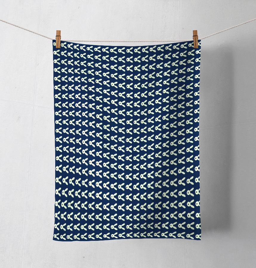 パターン説明 ディープグリーンカラーの背景にミント色のとても小さなウサギが配列されたパターン