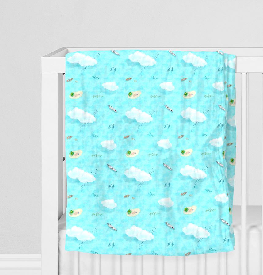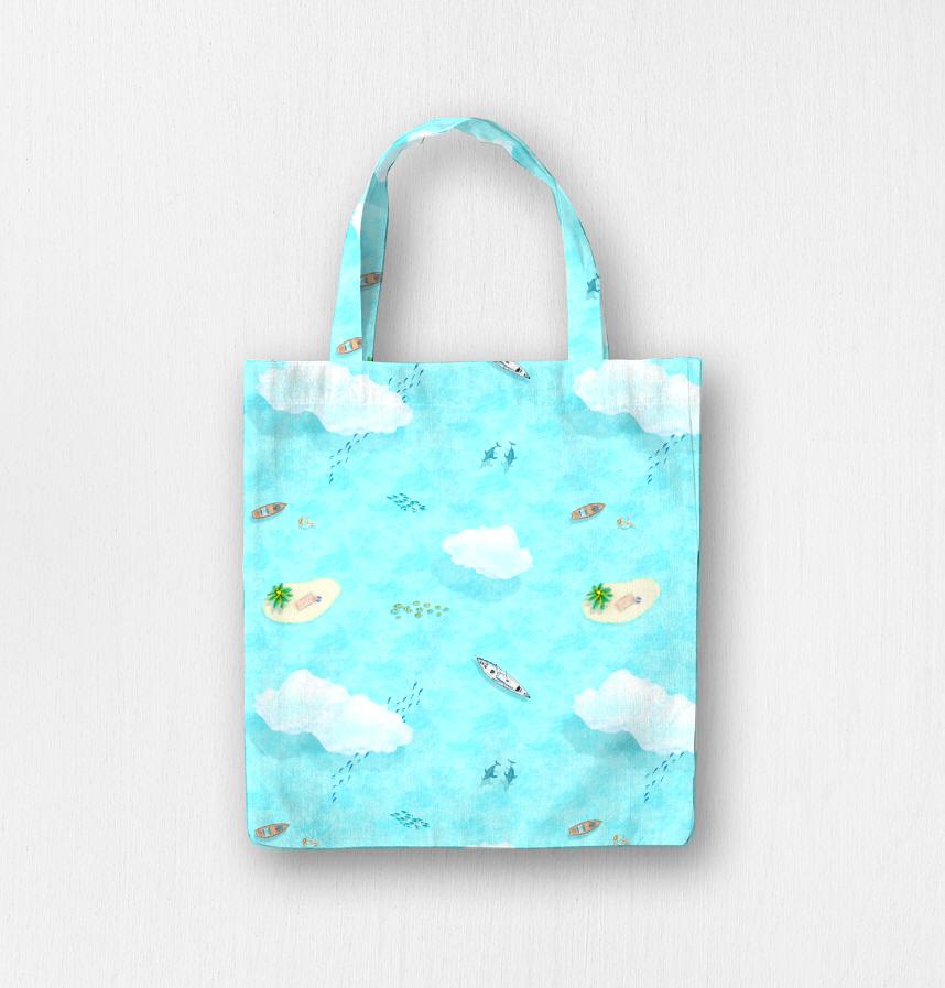大小のボート、小さな島、浮き輪でくつろぐ人、魚の群れやイルカなど、海っぽいモチーフが散らばります。