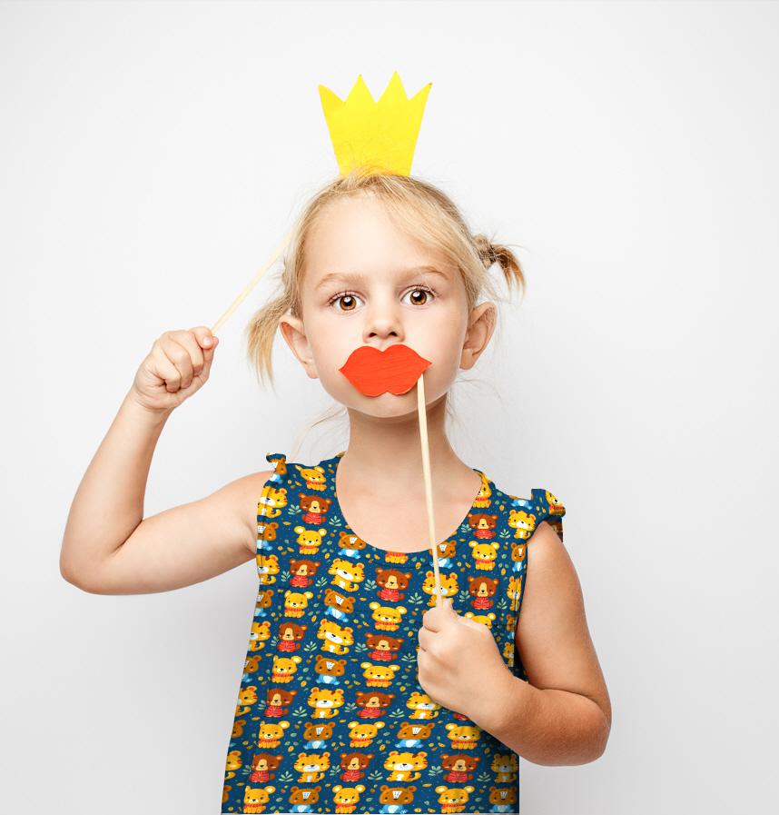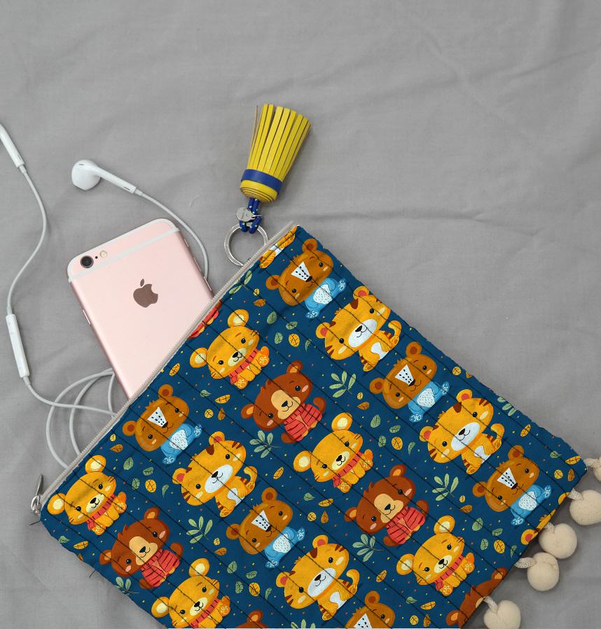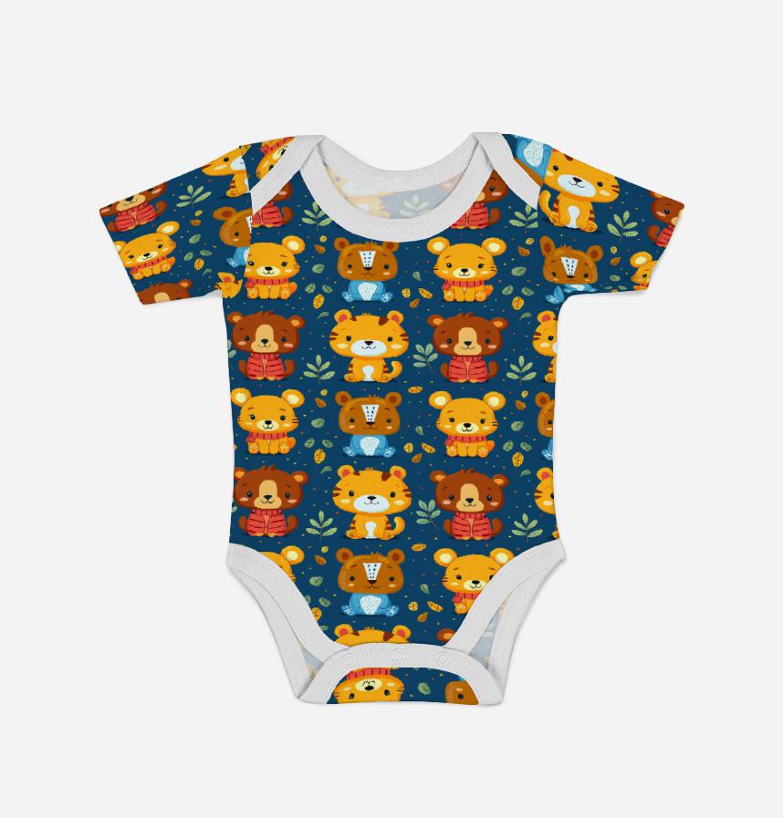 クマ、トラ、ライオンなどかわいい動物たちが暖かい色のスカーフを巻いており、冬の服のデザインや子供用品によく合います。背景に散らばった葉っぱは自然な感じを加え、全体的に明るくかわいい雰囲気を演出します。このパターンは子供だけでなく大人も好きなデザインです。