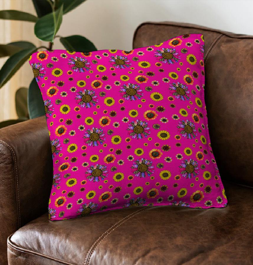 鮮やかなフクシアの背景に様々なひまわりを表現したデザインで
