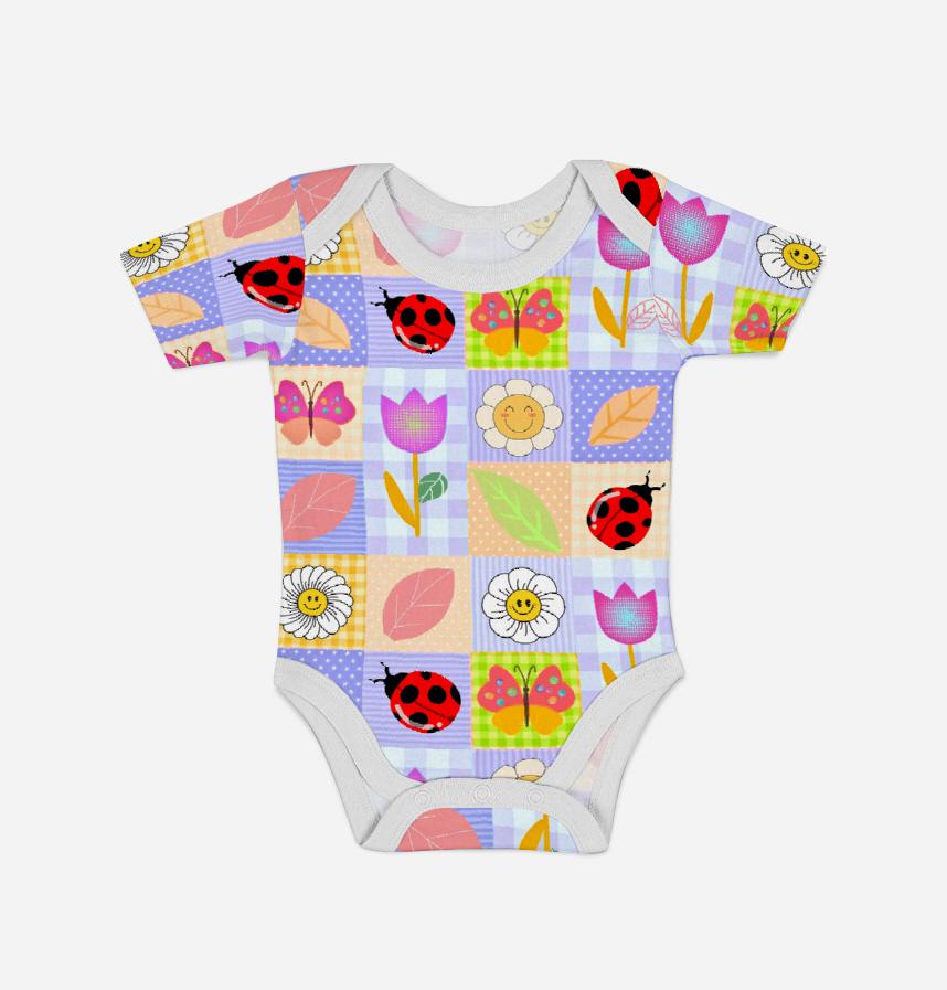 生気あふれる蝶、てんとう虫、チューリップ、葉などの要素が特徴