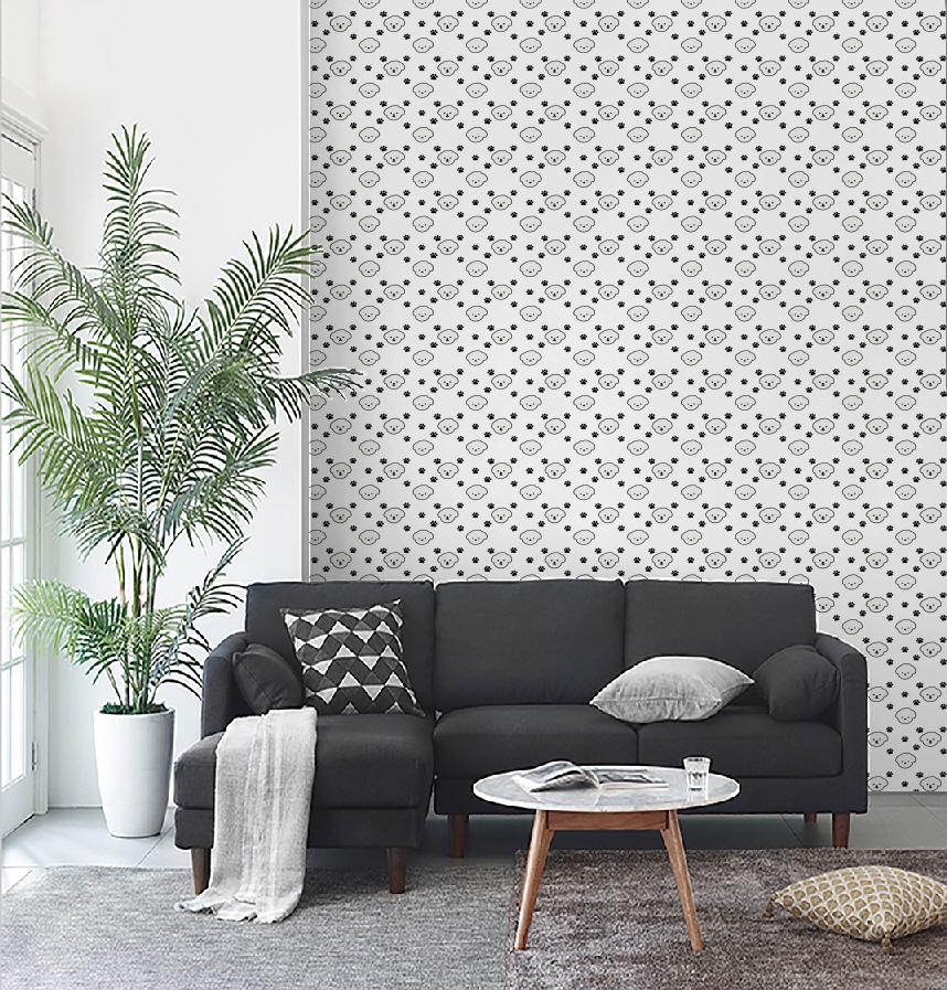 パターン説明 笑う子犬と無表情子犬が可愛くて間に足跡も可愛らしいパターン