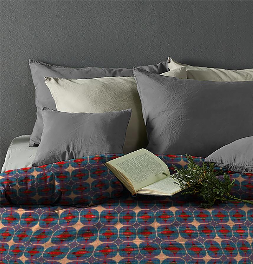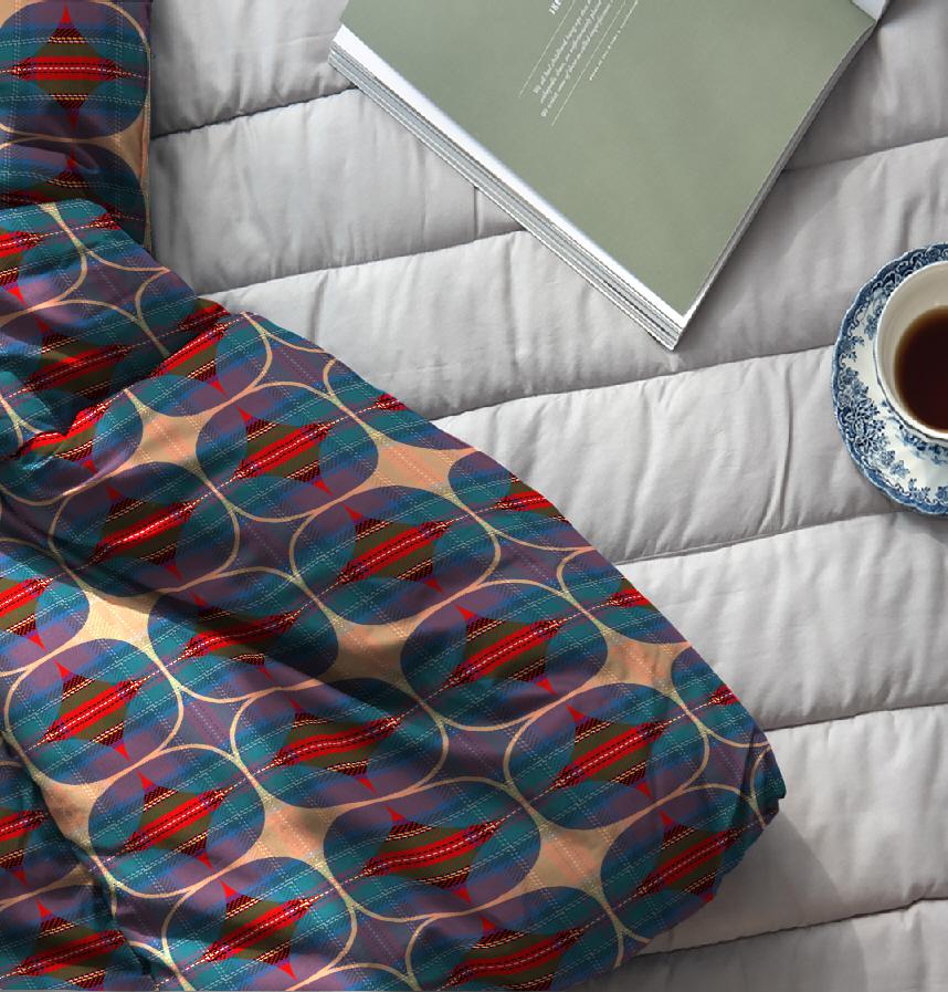 「ジオメトリックハーモニー」パターンは、精巧に配置された幾何学的図形で構成されています。各ユニットは円とダイヤモンドのジオメトリを組み合わせてバランスのとれたデザインを作り出します。主な色は青と赤の色で、互いに対比して視覚的な興味を引き起こします。円の中に位置する赤いダイヤモンドは、まるで炎のように見え、パターンに鮮やかな感触を加えます。