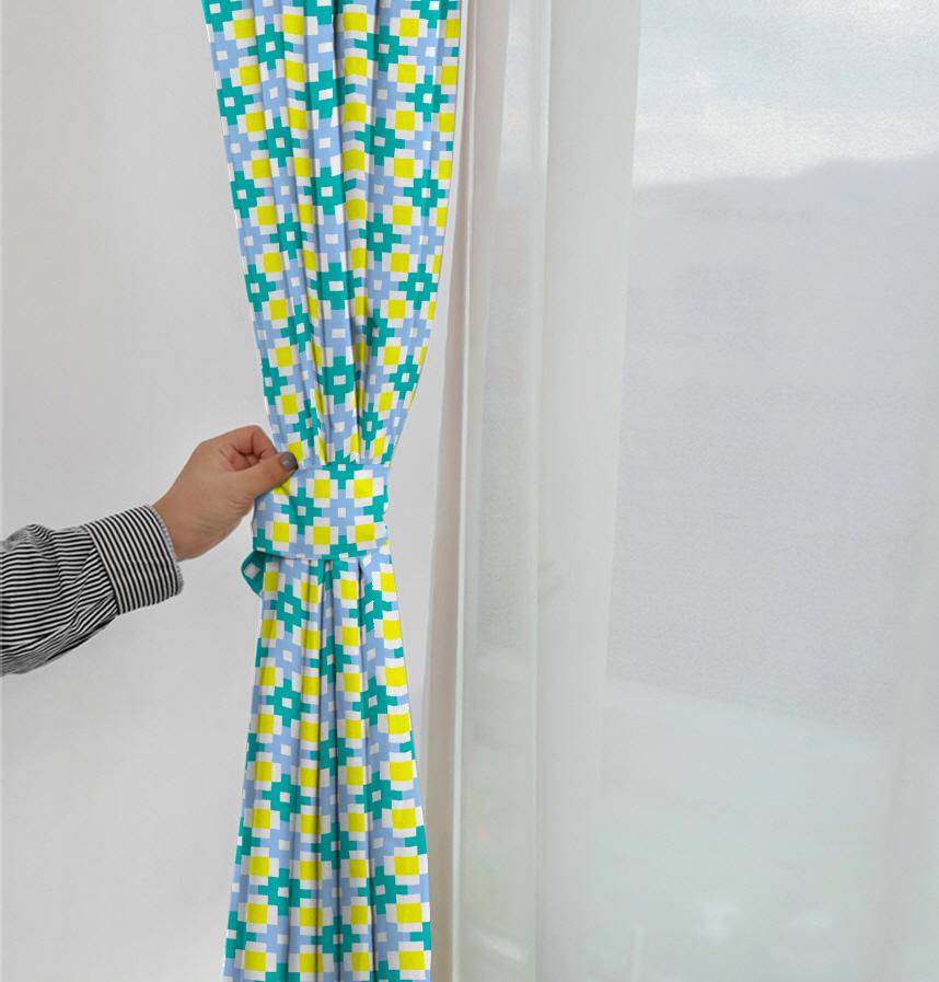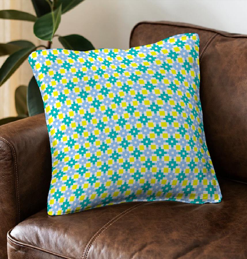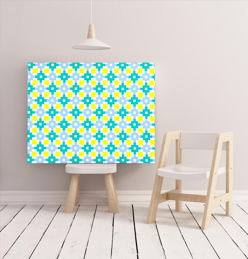 幾何学模様のかわいい模様です。 水色と緑がかった綺麗な青色に黄色の差し色で甘すぎないかわいさ。 クッションやバッグなどの小物、子供服などに向いています。 ファブリックパネルにしてお部屋に飾ると北欧風な印象になります。