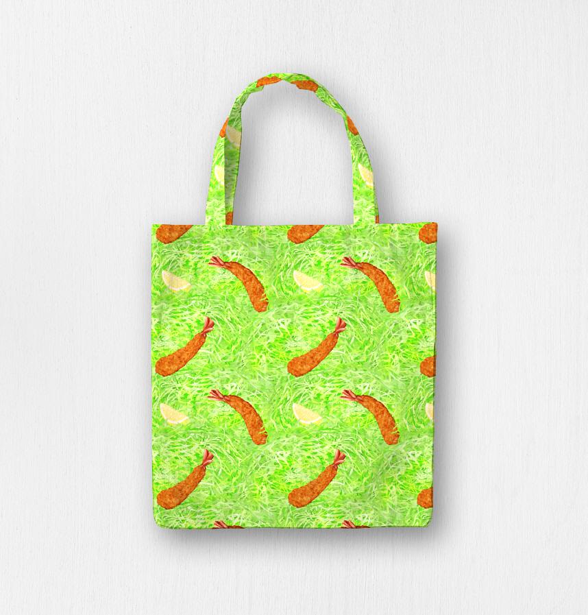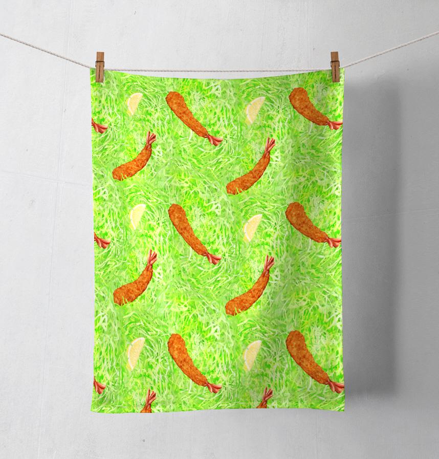 たくさんのキャベツの千切りを背景にエビフライをのせました。