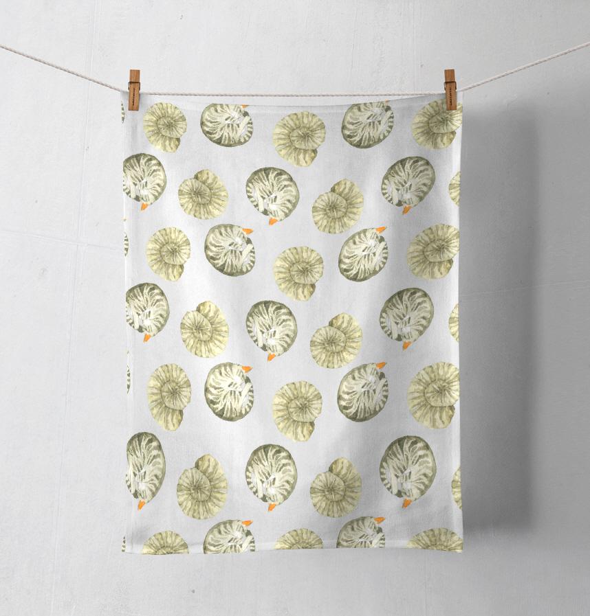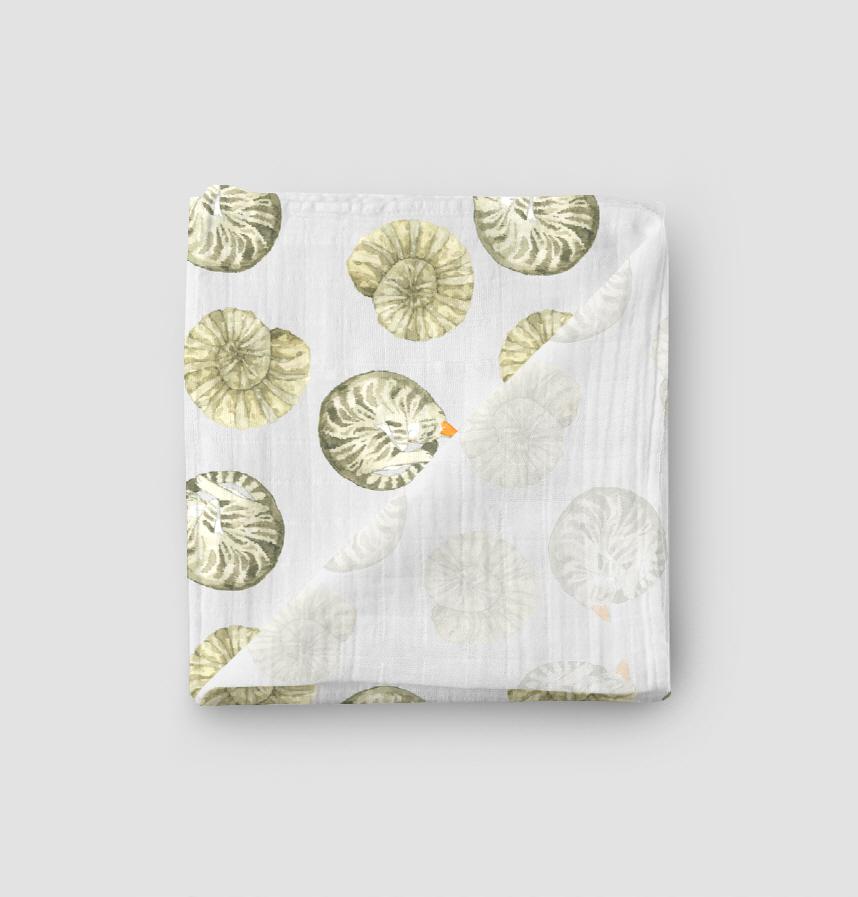 丸くなって眠る猫とアンモナイトの化石のパターンです。