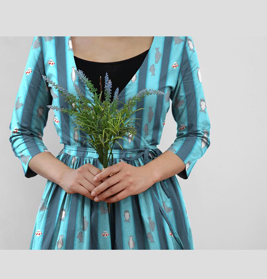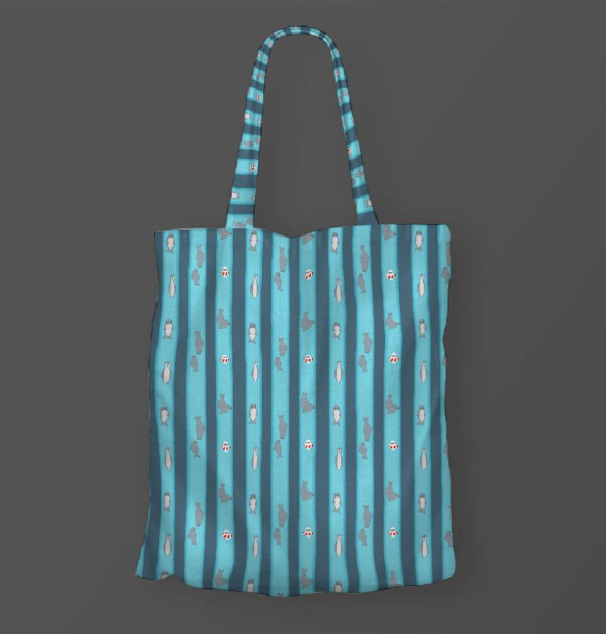 筒形の水槽の中を上や下に自由に泳ぐアザラシ達のストライプ風デザインです