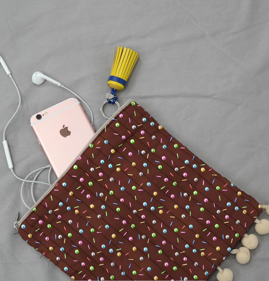 チョコレートの上にデコレーションされたアラザンとチョコスプレーのパターンです。