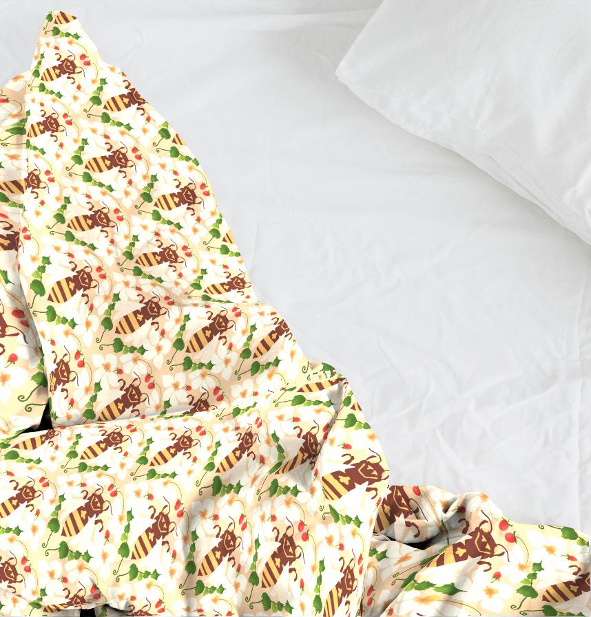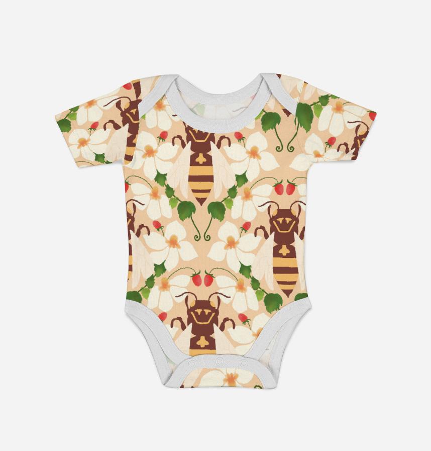 このパターンは、ミツバチとイチゴ、白い花が調和して調和したかわいい、さわやかなデザインです。ミツバチは茶色と黄色の縞模様の胴体に透明な翼を持っており、顔には親しみやすい表情を持っています。白い花はオレンジ色の花術を中心とし、緑の葉が豊富に配置されています。小さな赤いイチゴが花と葉の間にポイントとして配置されており、活気を加えます。