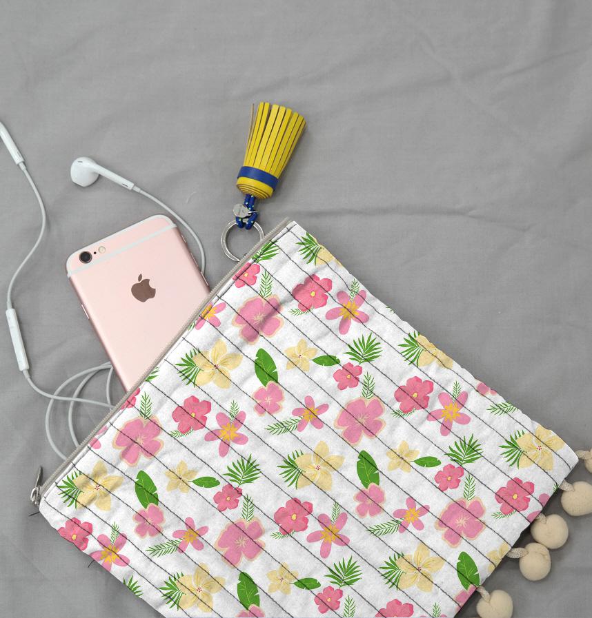 このパターンは、色とりどりの花と葉が調和し、夏の活気と活力を表現します。主にピンクと黄色の花が特徴で、明るく軽快な印象を与えます。背景は白に設定されており、花がより際立っています。
