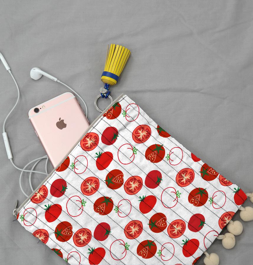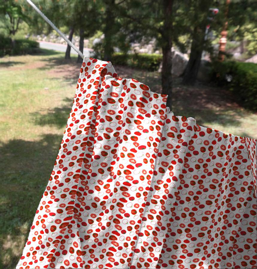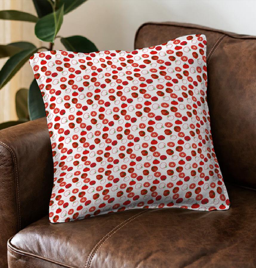 このパターンは、さまざまな形や色のトマトを繰り返し配置したデザインです。赤と白の調和が引き立って、新鮮で鮮やかな感じを与えます。トマトの全体姿と切った姿が一緒に表現されており、視覚的に興味深く、自然の要素をよく込めています。