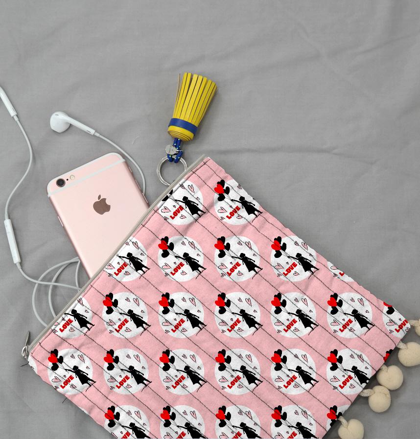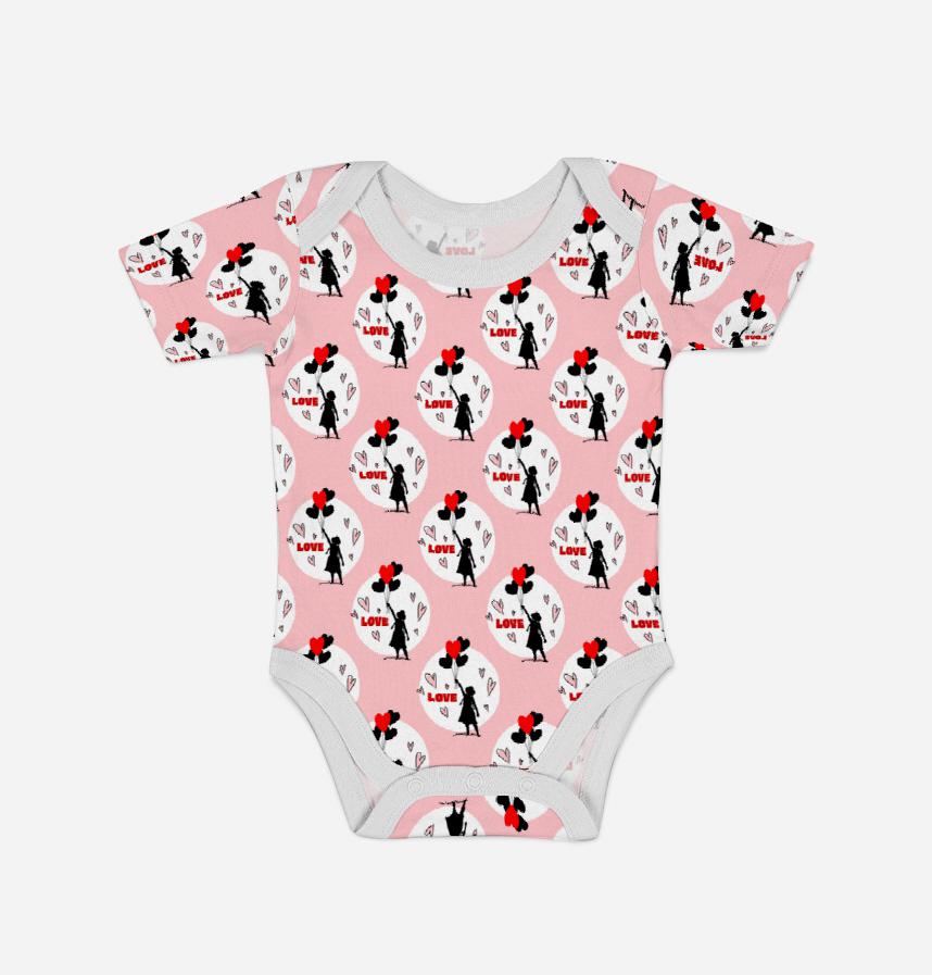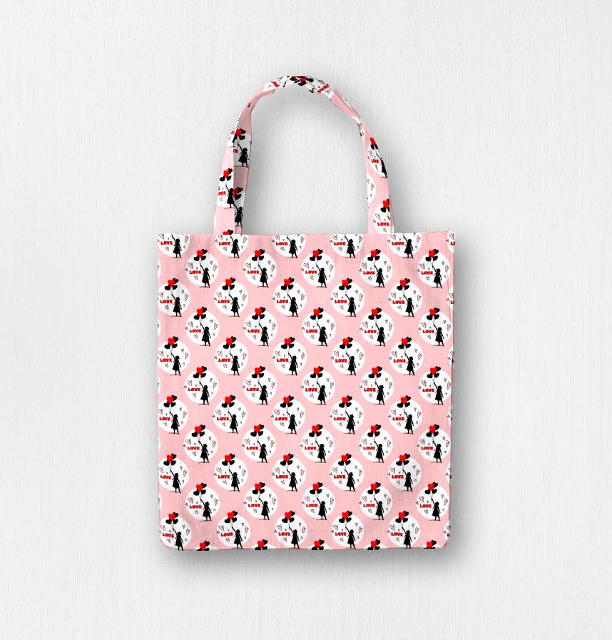 ハート風船を持つ少女とタイポグラフィを組み合わせたデザインパターンです。